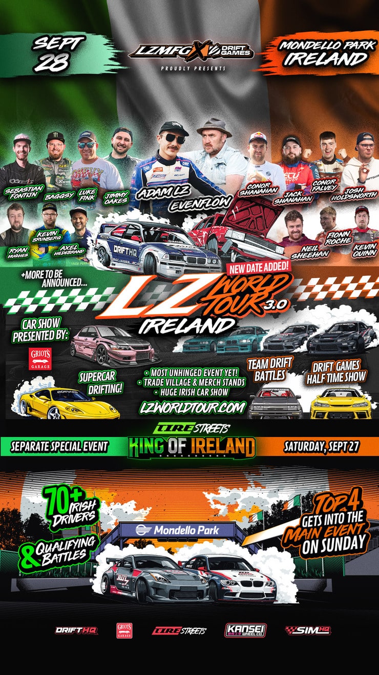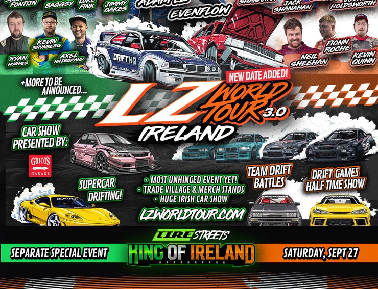 After a wild Saturday event in the UK, the LZ World Tour team are packing everything up, cars, drivers, tools, and chaos – and crossing the sea overnight for one more day of madness in Ireland. That’s right… on Sunday, September 28th, the LZ World Tour lands in Ireland for a one-off event built around one thing: settling the score between Evenflow and Adam LZ.