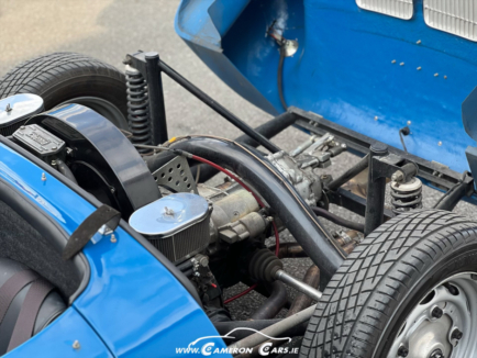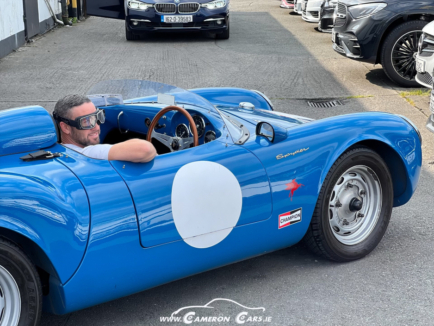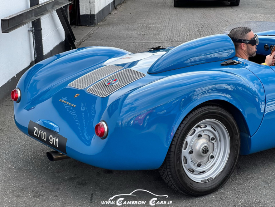 A Martin & Walker Porsche 550 Spyder Recreation HISTORY The limited number Porsche 550 Spyder was introduced at the 1953 Paris Auto Show and was quickly recognised wherever it appeared due to outstanding race success. It dominated the US and European championship circuit even against more powerful cars not even in its class and was the race choice of privateers earning a reputation as the Giant Killer. The beauty of the 550 was that it could be driven to the track, raced and then driven home, which showed the flexibility of being both a road and track car. Perhaps the most famous Porsche 550 built was James Dean’s “Little Bastard” which Dean fatally crashed into Donald Turnupseed’s 1950 Ford Custom on the 30th September 1955. EQUIPMENT GRP bodyshell, tubular steel chassis with steel rear bulkhead, De Dion axle located with four trailing arms and a Panhard rod, adjustable coilspring damper units, aluminium fuel tank, aluminium floor, perspex wind deflector, headrest fairing, Spyder and Porsche emblems, bonnet catches, wing mirror, wooden Nardi steering wheel, Willans seatbelts, passenger grab handle, passenger foot brace, push button start, rev counter and combined fuel/temperature gauge, dash mounted rear view mirror, kill switch, moulded door pockets, horn, tannaue cover. EXTERIOR Finished in vibrant period Porsche Blue there is absolutely no hiding in this incredible machine. The sleek low slung appearance is gorgeous at any angle drawing much admiration from onlookers who marvel over the flowing yet purposeful lines. The gold Porsche and Spyder lettering reveals the heritage and the stainless rear grilles and headrest faring leave no doubt of the fun lying ahead. INTERIOR Once in situ the Speedster style seats trimmed in black vinyl offer amazing support and looking over the wooden Nardi steering to the replica instrument set will start the pulse racing. Securely fastened by the Willans racing seatbelts the driving position is near perfect. ENGINE & TRANSMISSION Rear mounted and running a VW Type 4 engine displacing 2 litres built by Microgiant this power plant had been on the rolling road at BD Engineering and produces 110bhp and 122Ibft of torque. Sucking fuel through twin 40 Delorto carbs and barking through a custom stainless steel exhaust built by Aldens the sound is like no other! A 4-speed rebuilt gearbox gearbox is controlled by an expensive American Janmar Shifter kit to utilise the power. HISTORY FILE Martin and Walker offer a Spyder Replica both as kit for self-assembly or as turnkey vehicle individually built to customer’s specifications. This example is number six of a run of 11 built by highly respected Paul Foreman in Kent. Correctly registered as an historic vehicle on the registration document by Paul in 2007. Enjoyed for local rallies and European trips to Le Mans and to Spa in Belgium, this sports car is reluctantly offered for sale due the owner’s arthritis. A real motoring icon guaranteed to excite the fun loving petrol head or the 1950’s appreciating classic sports car fan. cameroncars.ie